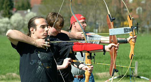 Trainingspausen-Zeit ist Fremdgehzeit. Das trifft zumindest wieder einmal für die 1.Herrenmannschaft zu, die sich vor dem eigentlichen Trainingsbeginn Anfang Mai derzeit beim Erproben einiger anderer Sportarten übt. Gestern stand Bogenschiessen im Schützenverein Reichertshausen auf dem Programm, was auch dank herrlichen Wetters für alle Spieler zu einer ungewohnten, aber sehr interessanten Sache wurde. Nach einigen Übungsschüssen wurde dann auch das größte Talent ermittelt, und das hieß am Ende Jochen Friedl, der mit 12 Schüssen sehr gute 68 Punkte erreichte.