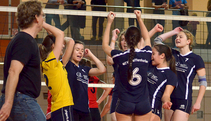 Dank an dieser Stelle an den erfolgreichen Ersatzcoach (und Ex-Damen-Spielerin) Irmi Sigl (ehem.Burkhardt)! E-männlich: Die bisher beste Leistung der Saison zeigte beim heutigen 3.Spieltag in Manching die männl. E-Jugend. Bisher war es der jungen, mit drei F-Jugend-Spielern antretenden Mannschaft, nicht gelungen, in vier Spielen einen Satz zu gewinnen...im heutigen 1.Spiel gegen den Gastgeber aus Manching sollte dies jedoch endlich gelingen. Vor allem mit einer durch das Training der letzten Woche stark verbesserten Aufschlag-Quote feierte man im 2.Satz mit 25:13 den Satzausgleich, und auch wenn der anschließende Tie-Break knapp verloren wurde, so präsentierten sich alle Spieler in aufsteigender Form. Noch mehr zu Feiern gab es dann - durchaus etwas unverhofft - in der zweiten Partie gegen die "Erste" der beiden Teams ![]() Großer Jubel über den ersten Saisonsieg gegen den MTV München FOTO: Berger vom MTV München. Gegen den etwas reiferen, aber auch merklich lustloseren Gegner kam in Reihen der Pfaffenhofener sogar noch einmal etwas mehr Ehrgeiz auf. Mit konstant guten Aufschlägen von oben (vor allem von Kapitän Florian Berger und Youngster Ruslan Mann) sowie einer verbesserten Laufarbeit konnten die Münchner zu jeder Zeit in Schach gehalten werden und der erste Saisonsieg in der neuen Mannschafts-Zusammenstellung war schließlich der Lohn der guten Tagesform. Uwe Lessel Es spielten: Florian Berger, Florian Maier, Ruslan Mann, Leo Ritzenthaler, Maxim Bogacev E-weiblich: Vor heimischem Publikum (erstmals überhaupt fand ein Volleyball-Spieltag in der neuen Halle der Mittelschule statt) durften sich heute die zwei weiblichen E-Jugend-Mannschaften präsentieren. Dabei