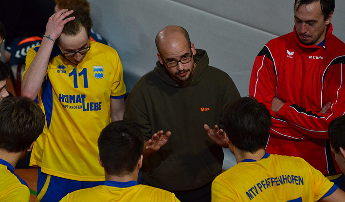 Herren 1: Den ersten Spieltag im Oktober hatte der MTV noch verletzungsbedingt mit nur 8 Spielern bestreiten können; durch die Genesung einiger Spieler und somit einem 12-Mann-Kader standen Trainer Max Krönauer beim gestrigen Heimspieltag diesmal jedoch deutlich mehr Optionen zur Verfügung. Gleich im ersten Satz gegen die junge Mannschaft des MTV Ingolstadt 3 zeigten die Pfaffenhofener eine starke Leistung und gewannen diesen überzeugend mit 25:8. Obwohl Trainer Krönauer beim Seitenwechsel davor warnte, ließ die Konzentration im zweiten Satz deutlich nach. Trotzdem konnte die Mannschaft unter ihrem Kapitän und Zuspieler Felix Bauer auch den zweiten Satz mit 25:17 für sich entscheiden. Im dritten Satz kamen alle drei Jugendspieler, unter ihnen auch das Geburtstagskind Phillip Thaller, zum Einsatz. Sie zeigten phasenweise sehr guten Volleyball, konnten aber nicht ganz so konstant ihre Leistung abrufen wie ihre älteren Mitspieler. Ein 25:22 war das Resultat und somit stand der 3:0-Sieg fest. Mit bisher 6 Punkten in der Tabelle und einer starken Mannschaft schickte im 2.Spiel der SSV Schrobenhausen einen ernst zu nehmenden Gegner auf das Feld. Gleich im ersten Satz zeigten die Schrobenhausener unter ihrem starken Zuspieler Thorsten Wohlfarth, warum mit ihnen zu rechnen war. Durch das schnelle Spiel des SSV entstanden zeitweise Lücken im Pfaffenhofener Block die zu einem 21:25 Satzverlust führten. Durch einige personelle Wechsel des Trainers![]() Gibt seit dieser Saison den Ton an: 1.Herren-Trainer Max Krönauer stabilisierte sich im zweiten Satz die Leistung des MTV und die Mannschaft konnte ein 25:23 erspielen. Es entwickelte sich eine hochklassige und spannende Partie in der sich beide Mannschaften nichts mehr schenkten. Im 3. Satz bekamen die Zuschauer einen hart umkämpften Satz zu sehen, den der MTV auch mit 29:27 für sich entschied. Nach dem Seitenwechsel verpassten es die Pfaffenhofener, ihren 4. Satz zu gewinnen und verloren knapp mit 24:26. Im entscheidenden Tiebreak zog die Mannschaft um Kapitän Felix Bauer gleich zu Beginn mit 7:0 davon und ließ danach auch nichts mehr anbrennen. Mit dem 15:8 Endstand im Tiebreak gewann der MTV sein viertes Spiel in Folge und steht somit an der Tabellenspitze. Nun gilt es für Trainer Krönauer im Hinblick auf die