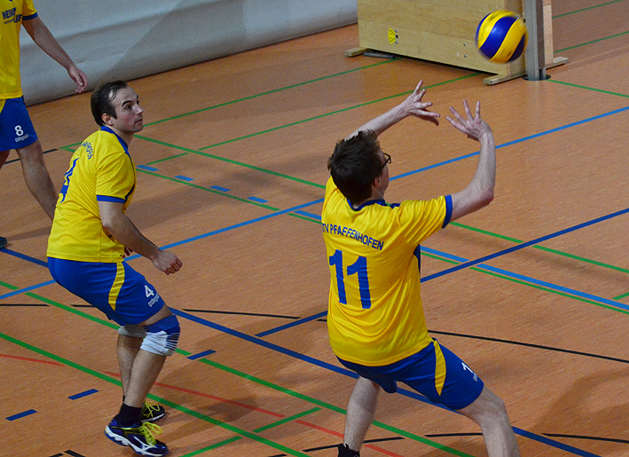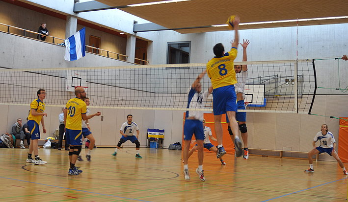 Birkmeier, Clara Segador und Franzi Krauß. Der 1.Satz wurde vollkommen souverän und unaufgeregt durch unser Spiel dominiert, und mit 25:9 abgeschlossen. Im folgenden Satz wurde durch Umstellung ein wenig nervös und konfus begonnen. Obwohl die Spielstärke des Gegners uns nicht unter Druck setzte, konnten wir bis zum Spielstand von 20:19 nicht an das Spiel des ersten Satzes anknüpfen. Durch einige druckvolle Aufschläge und ein wenig Glück haben wir dann doch noch mit 25:22 gewonnen. Im dritten Satz wurden schließlich in Idealbesetzung, mit druckvollem Spiel von Beginn an, klare Zeichen gesetzt. Bei 25:9 war dann Schluss und wir hatten die wichtigen 3 Punkte eingefahren. Im Fazit kann man sagen, dass die Hohenwarter eine nette und freundliche Truppe sind und wir eher über unkonventionelle Ballwechsel Punkte abgaben als durch hochklassiges Voleyball. Charly Kaufmann Es spielten: Silvan, Gabi, Erna, Jutta, Wolfgang, Klaus, Walter und Charly. Sonntag, 18.10.15 Sieg und Niederlage für 1.Herren bei Heimspiel-Premiere - Erfolgreiches Wochenende für Jugend-Teams ![]()